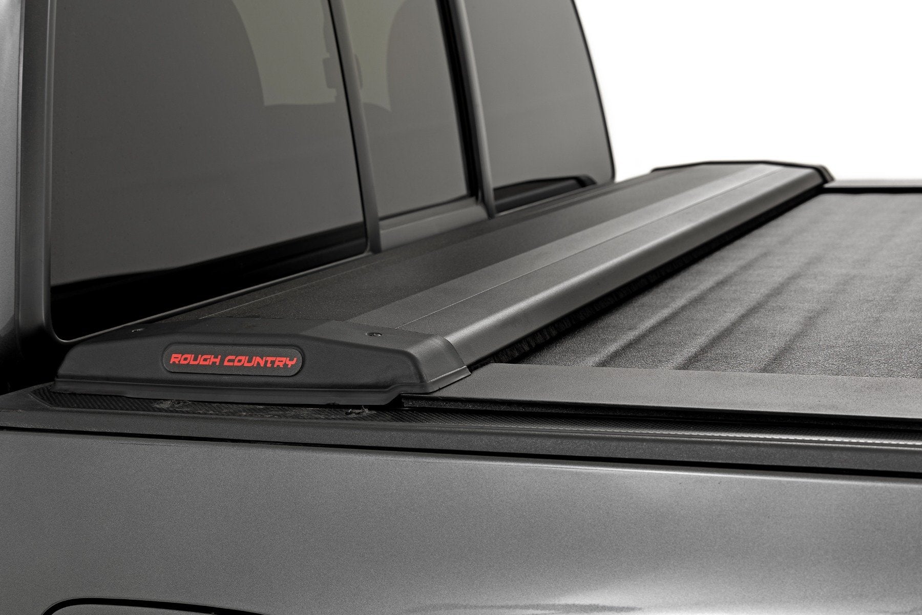 Superior Protection and Functionality. Protect your bed from weather and add security with Rough Country's sleek Retractable Bed Covers. Boasting a weather-resistant vinyl covering over a rigid aluminum panel design Rough Country's Retractable Covers sit firmly on the bed rails allowing for full rear visibility.