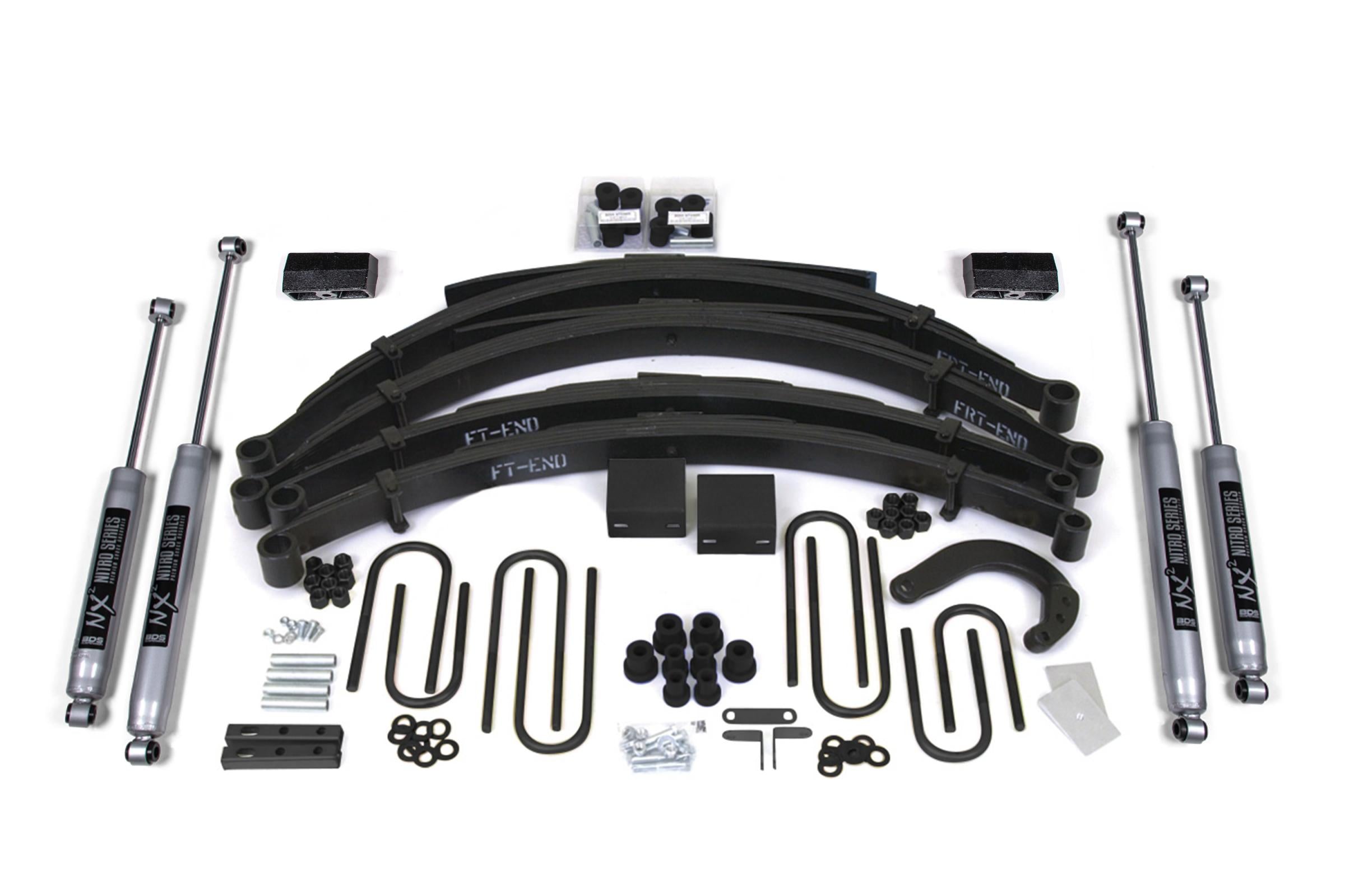 Up front the lift kit includes Glide-Ride leaf springs, 4 inch steering arm and 3 inch steering block for steering correction, brake line brackets, sway bar drop brackets and precision tuned NX2 nitrogen charged shocks. In the rear this kit utilizes a set of Glide-Ride leaf springs for the ultimate performance on and off road, new u-bolts and a matching set of NX2 Nitro shocks.