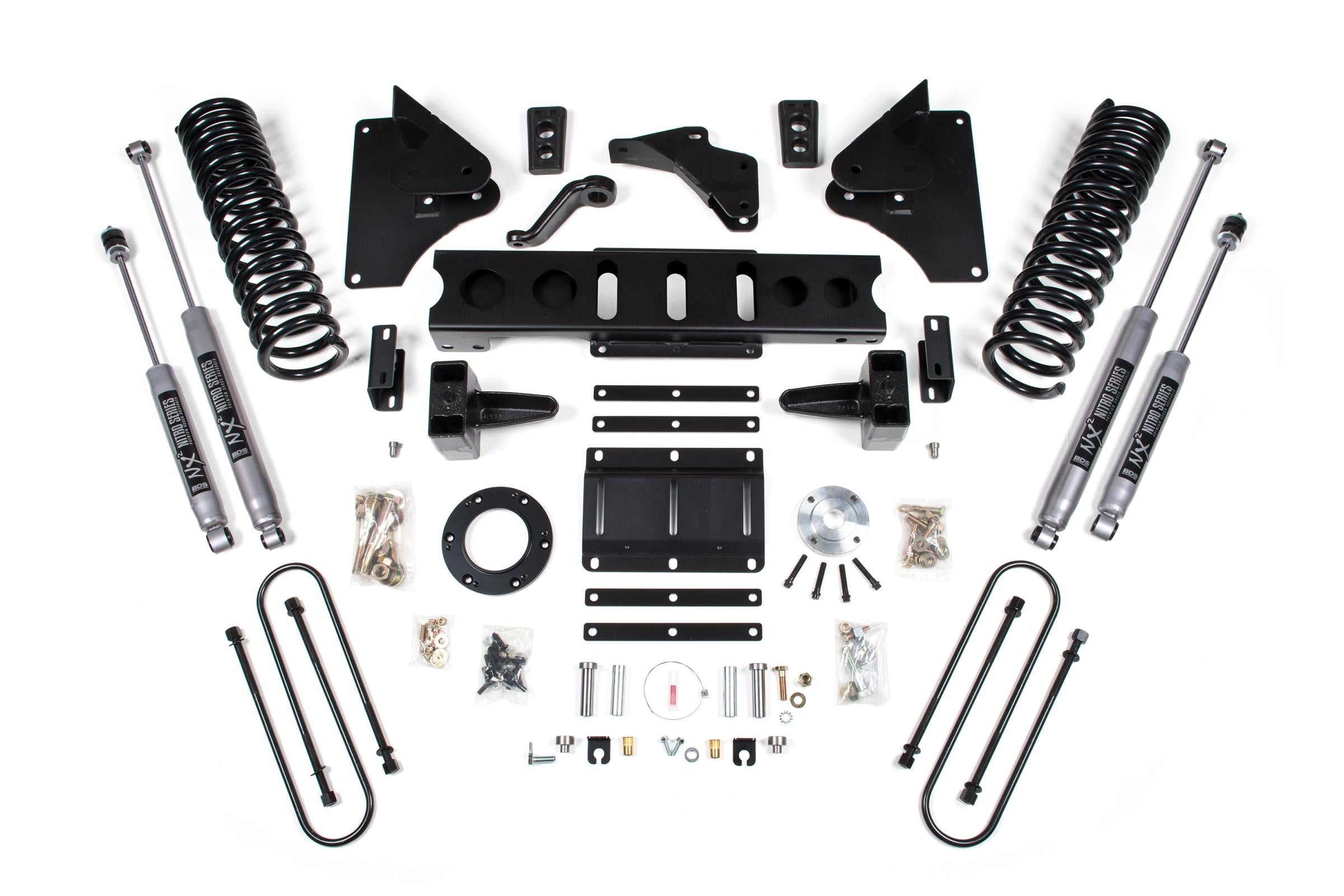In the rear this kit utilizes a high-strength fabricated lift block, longer u-bolts and a matching set of NX2 Nitro or FOX 2.0 Performance shocks.