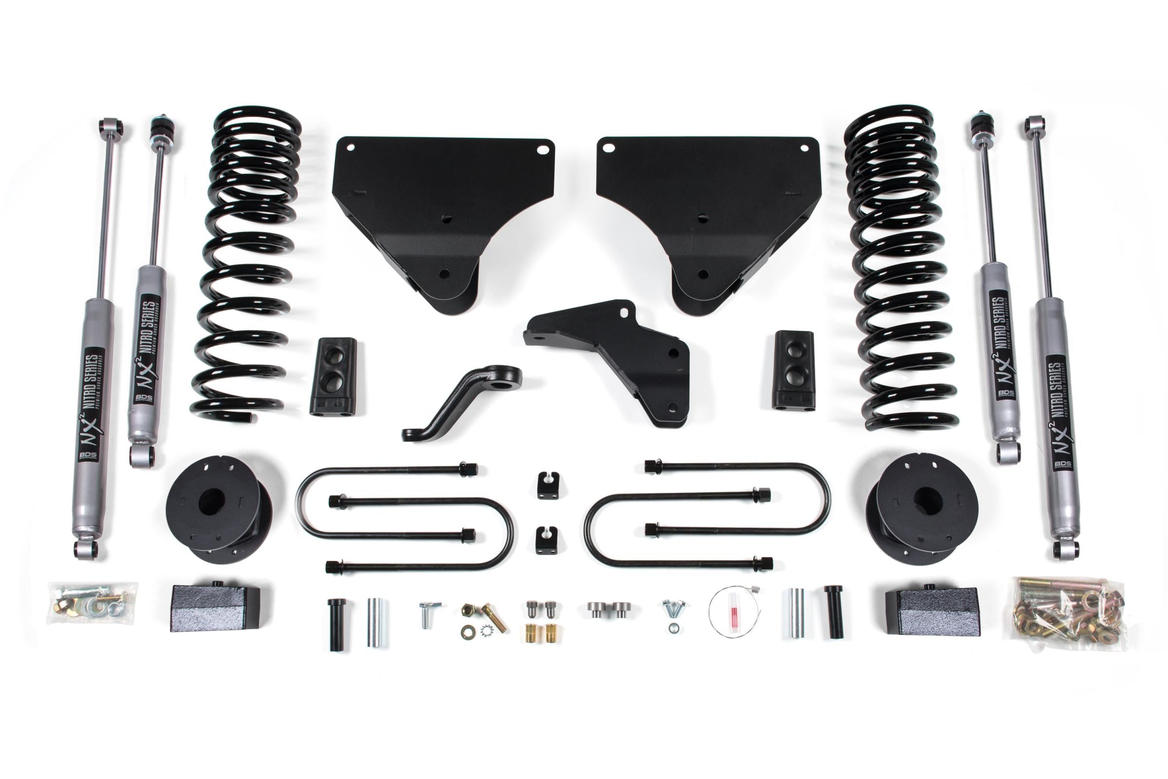 In the rear this kit utilizes a high-strength fabricated lift block, heavy duty air bag spacer, longer u-bolts and a matching set of NX2 Nitro or FOX 2.0 Performance shocks.