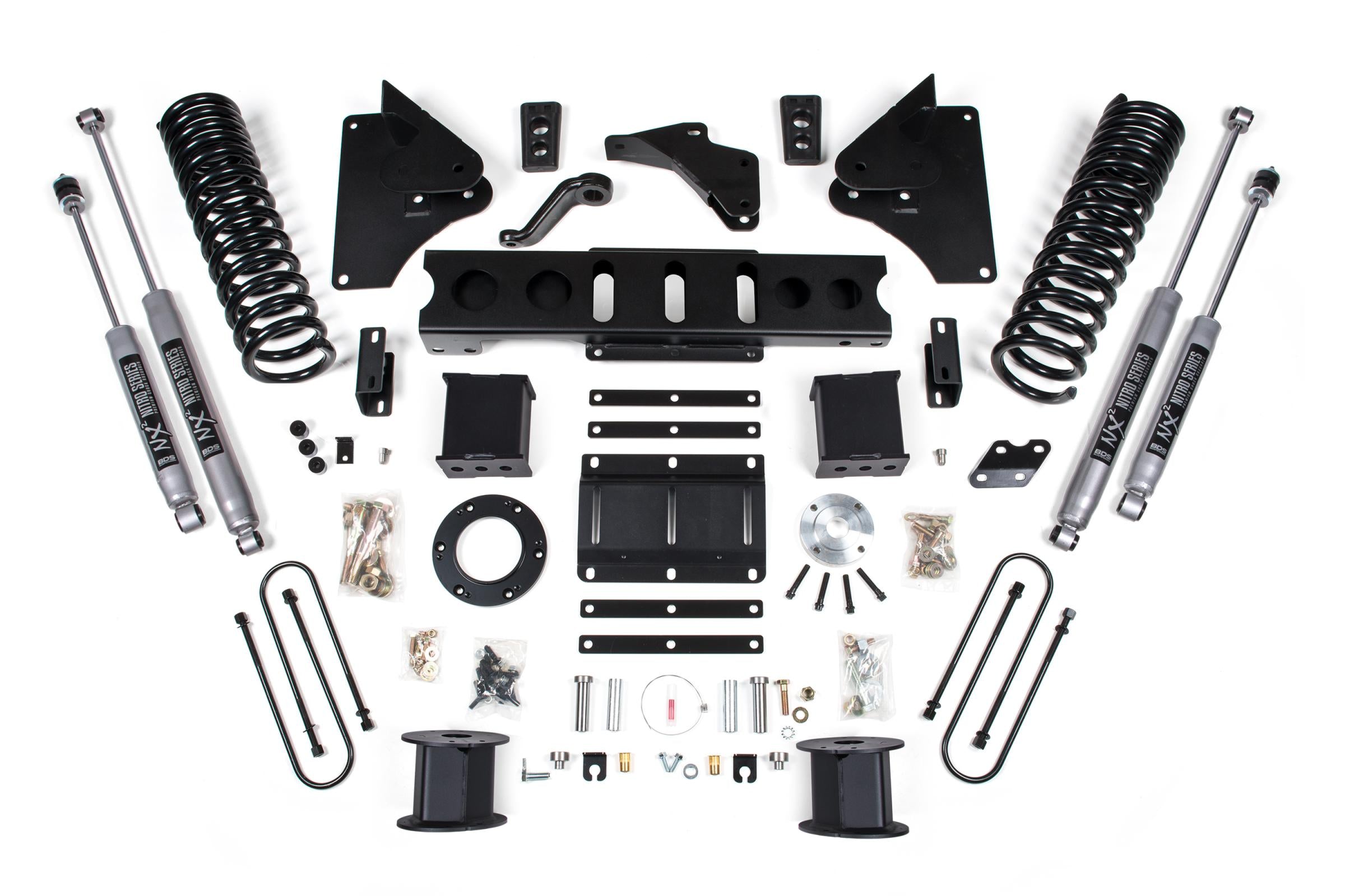In the rear this kit utilizes a high-strength fabricated lift block, heavy duty air bag spacers, longer u-bolts and a matching set of NX2 Nitro or FOX 2.0 Performance shocks.