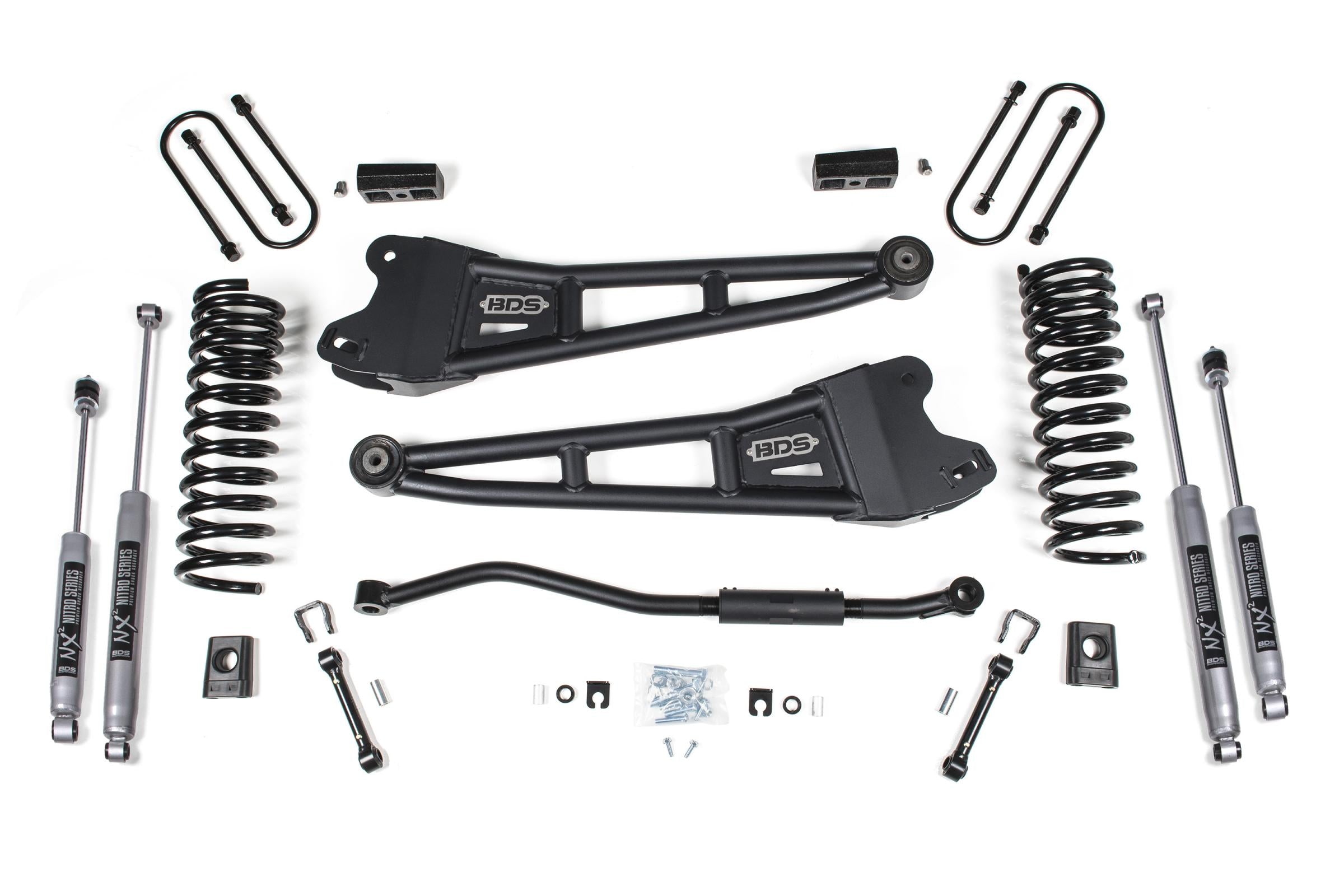 Up front the lift kit includes diesel-specific Pro-Ride coil springs, heavy duty replacement radius arms, high strength 1-3 8 inch solid steel track bar for steering correction, sway bar links, brake line brackets and precision tuned NX2 or FOX 2.0 nitrogen charged shocks.