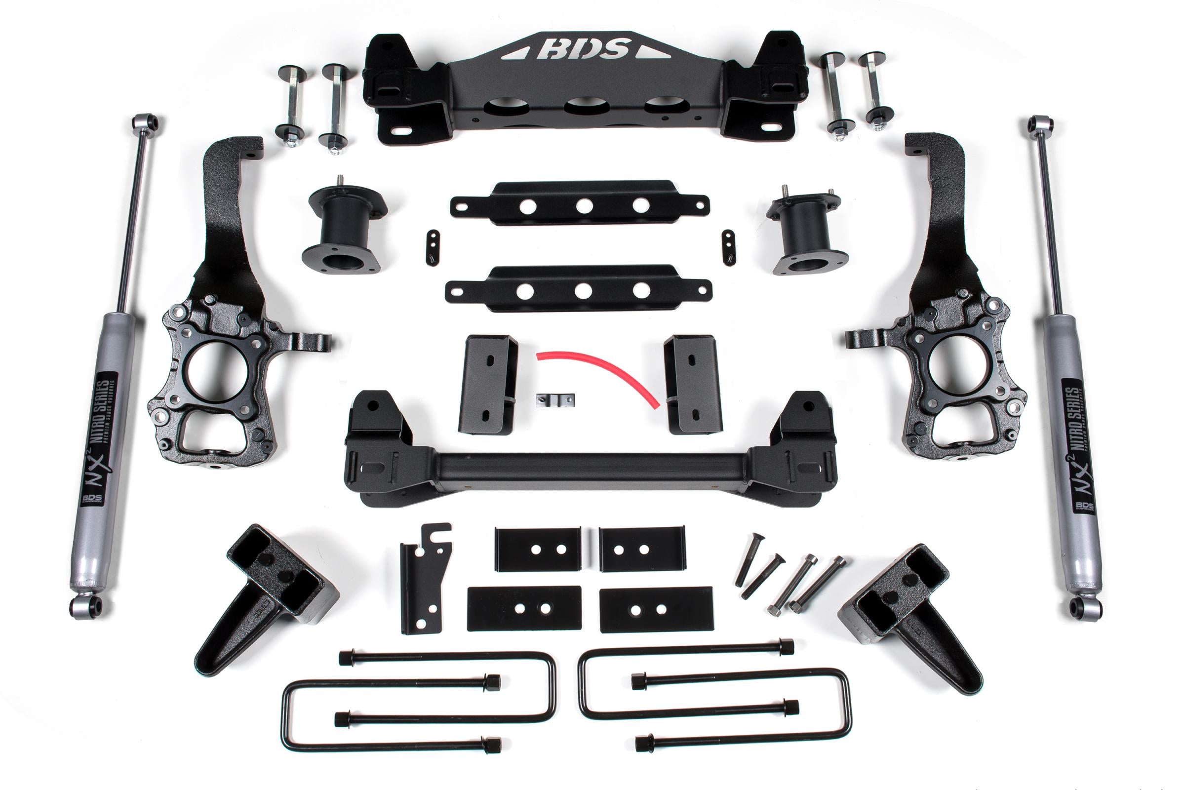 In the rear BDS utilizes high strength cast steel lift blocks and longer u-bolts to lift and level the stance along and NX2 Nitro or optional FOX 2.0 Performance Series shocks.