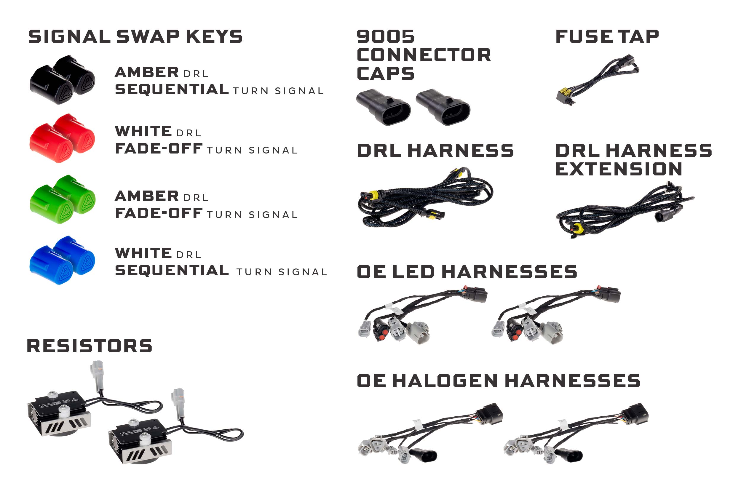 • Wiring: 2x Halogen Adapters, 2x LED Adapters, 2x Magnet Mount Resistors, 1x DRL Harness, 1x DRL Harness Extension, 1x Fuse Tap