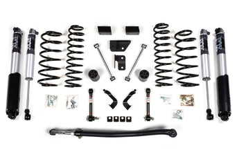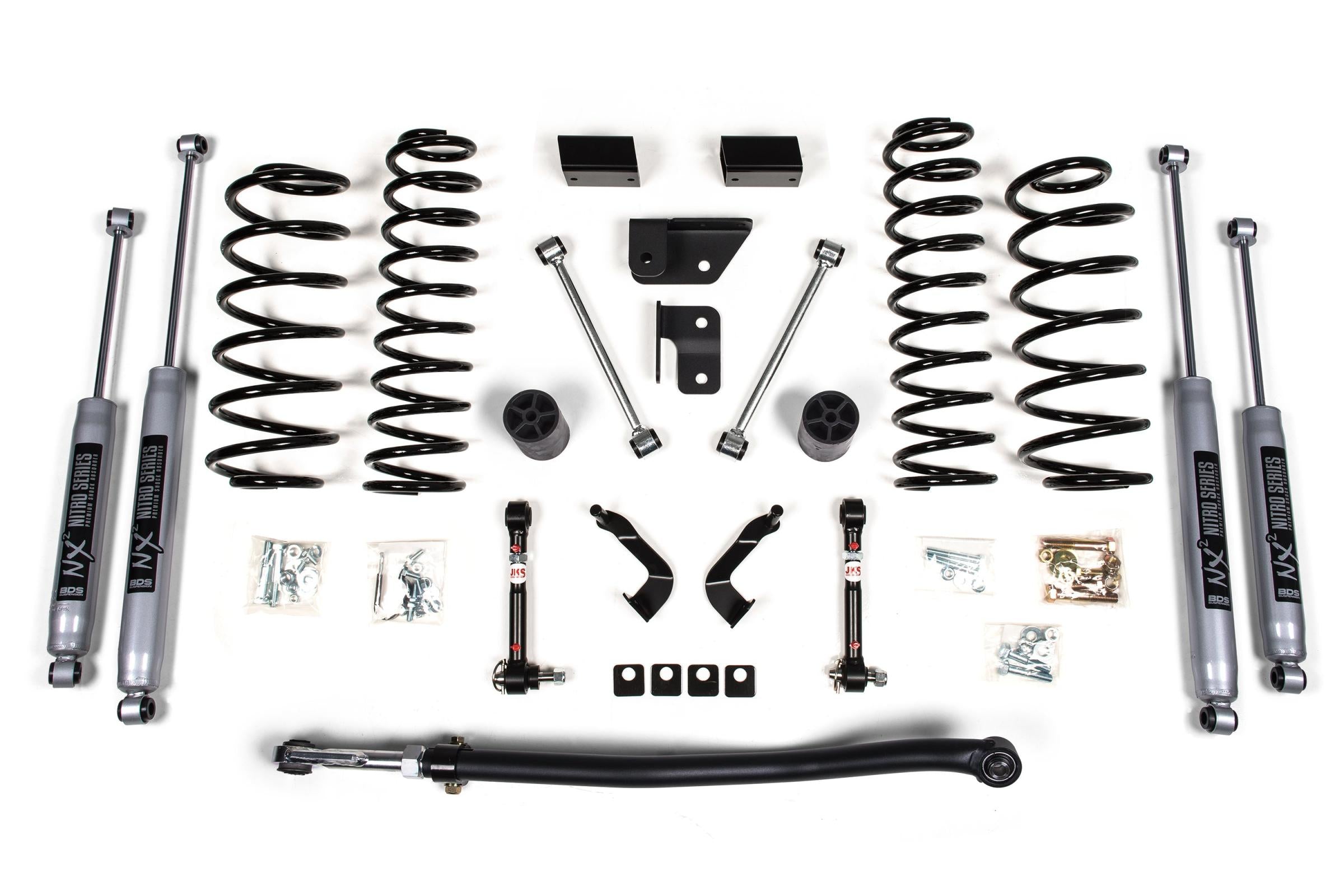 The lift kit includes front and rear BDS Pro-Ride Coil Springs, a heavy duty adjustable front track bar is utilized to re-center the front axle, bump stop extensions, front lower control arm cam locks, JKS quicker disconnects to unlock the front suspension's potential to flex while maintaining quiet on road operation, rear sway bar links, and your choice of specially tuned NX2 nitro series gas shocks or FOX 2.0 Internal Floating Piston performance series gas shocks to offer improved damper performance.