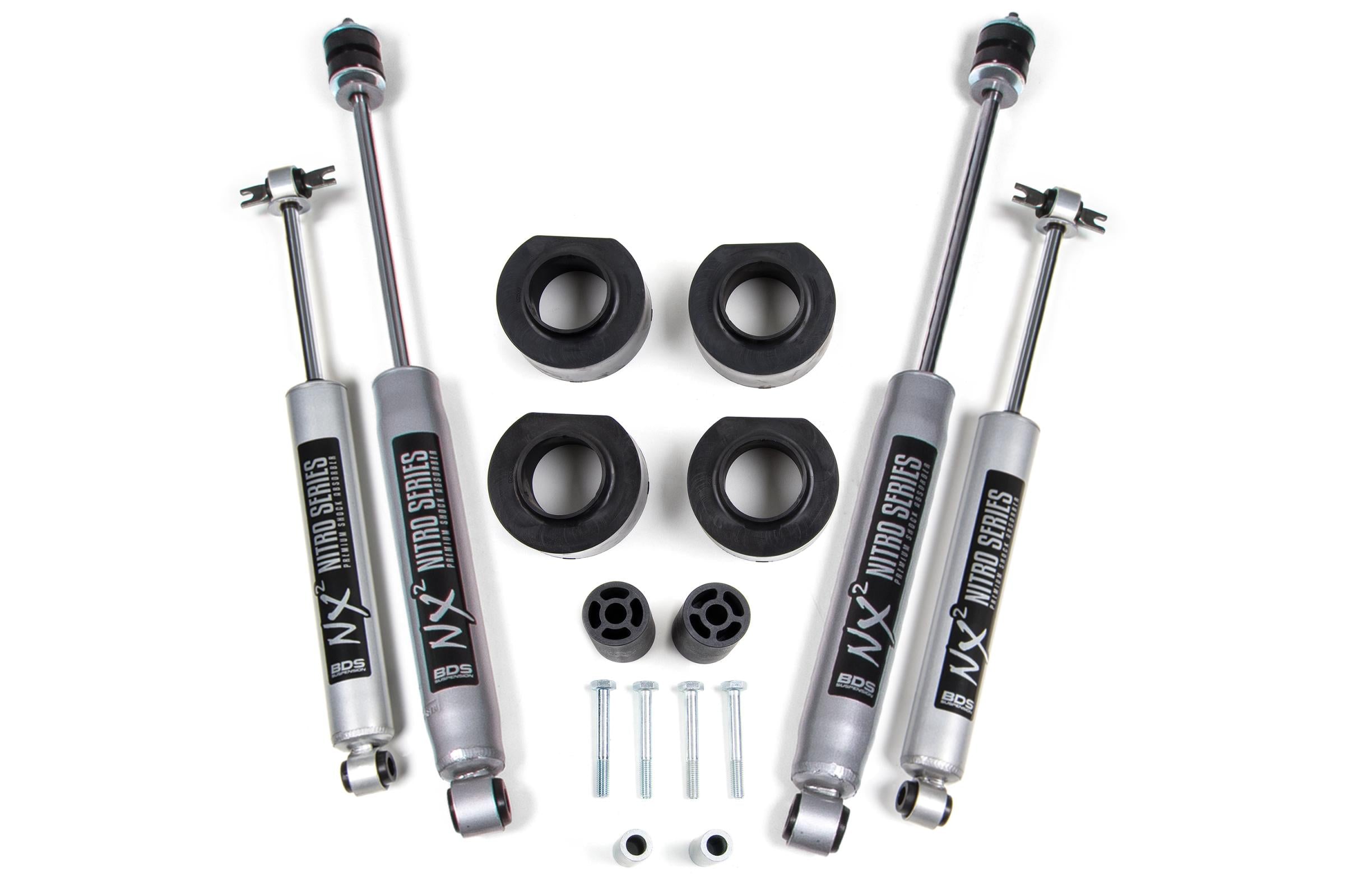 The lift kit includes front and rear 1-3 4 inch urethane coil spring spacers, front bump stop extensions, and NX2 Nitro or FOX Performance series shocks. Give your Jeep TJ the extra height with this 1-3 4 inch lift kit from BDS Suspension.