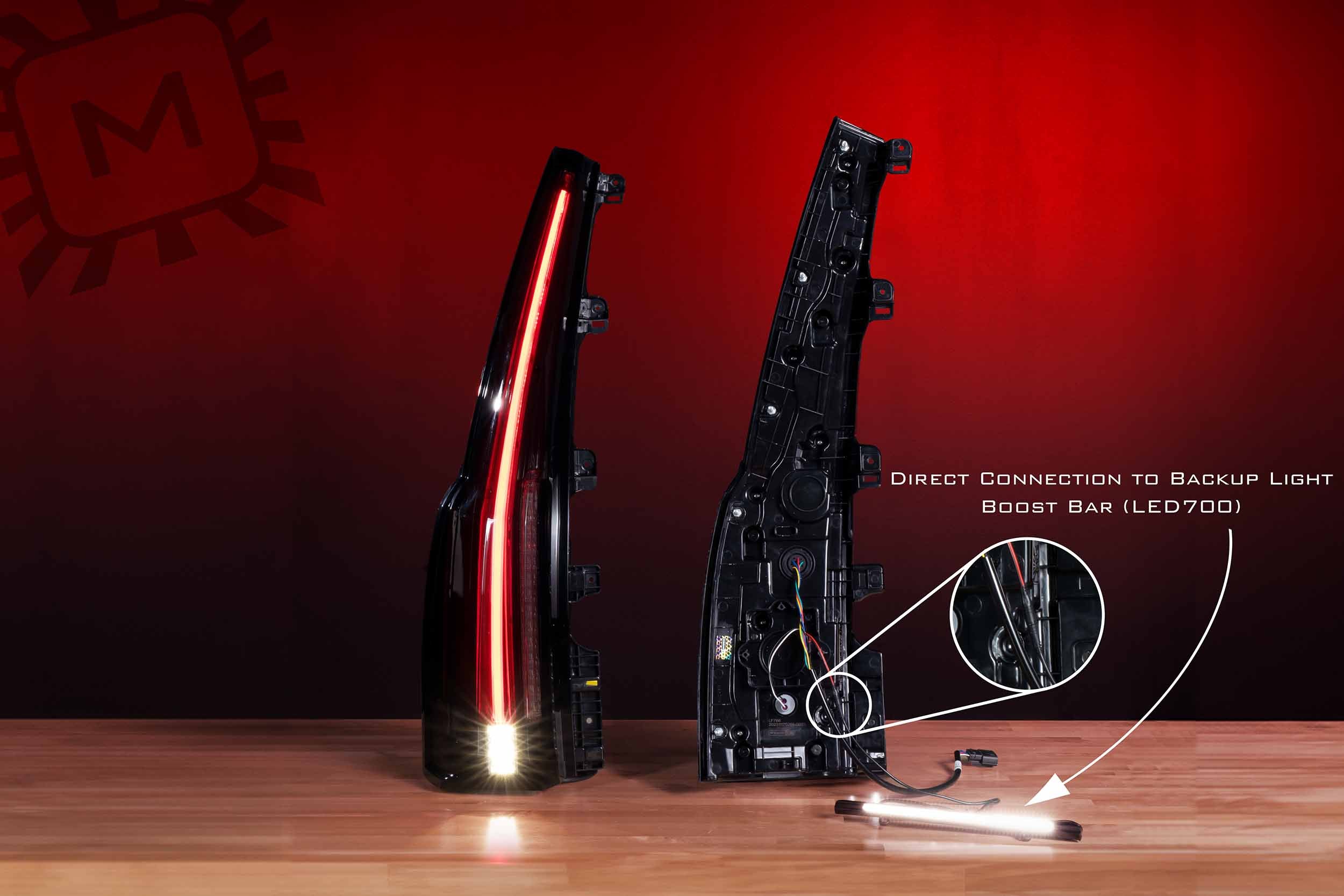 Style: Inspired by the design of the more modern looking tail lights from the Escalade, these look right at-home on the rear end of the Yukon too. The linear 3D light blades serve as the brake light and turn signal. The turn signal, which blinks in amber and the brake, which of course is red are both equally impressive in the intensity department both day and night. Compared to similar tail lights online, the overall fit and finish are much more OEM-like on the Morimoto version, easily making these the best set of aftermarket tail lights on the road for the Yukon! Reverse Lights: Are often over-looked, but not with the Morimoto XB tail lights for your Yukon. While they come standard with LED reverse lights, just wait, there's more! These tail lights allow a plug n play installation with the optional LED Backup Boost Bar which mounts to the top of your license plate frame and provides an extra 2,700 lumens of controlled light output in reverse. Yeah, Morimoto customers like to see where they're going in reverse too! Style and Safety: All Morimoto tail lights are designed to comply with all DOT, SAE regulations for rear-facing lamps. We pride ourselves on offering stylish, high-performance and safe products for serious enthusiasts, which is why all new Morimoto products are verified by trusted third party labs for compliance and are backed with an industry-leading five-year warranty. Full Compatibility: The XB Tail Lights are compatible with all 15-20 Yukons and are 100% plug n play during installation. No modifications are required to install the tail lights, or the optional boost bar reverse light.